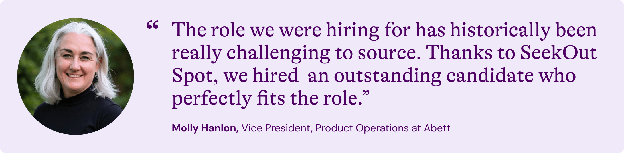 SeekOut Spot delivered speed and precision to transform Abett’s hiring process. By drastically shortening candidate evaluation timelines from weeks to days, Abett secured an outstanding hire fast with greater confidence in candidate quality.